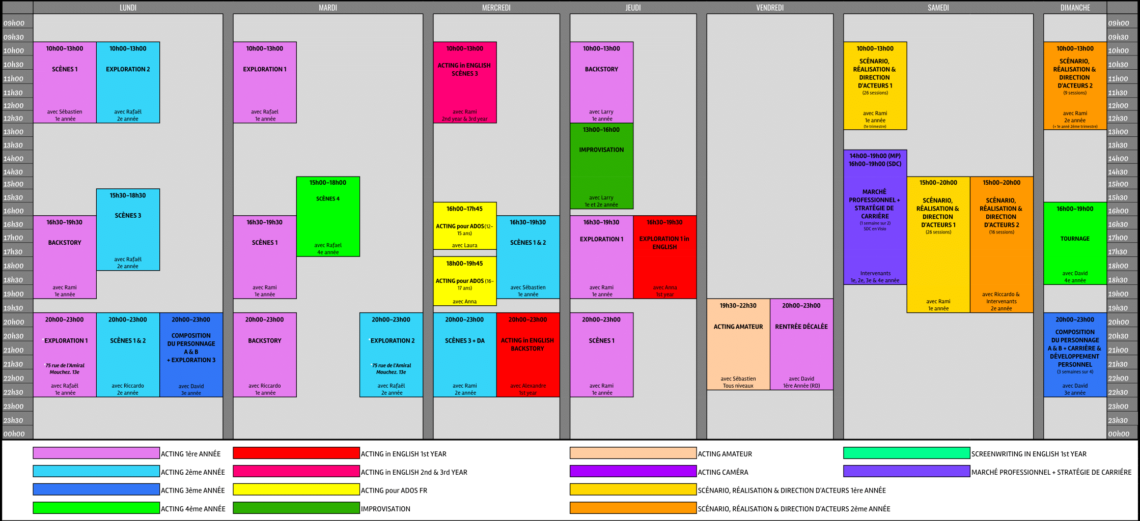Pour avoir le programme complet d’Acting 1ère année, vous devez choisir au moins un atelier d’Exploration 1, un atelier de Scènes 1 et un atelier de Backstory. Ces ateliers peuvent être pris le matin, l’après-midi ou le soir afin de s’adapter à votre activité professionnelle ou vos études. Il en va de même pour les ateliers d’Acting 2ème année : Exploration 2, Scènes 1&2 et Scènes 3.